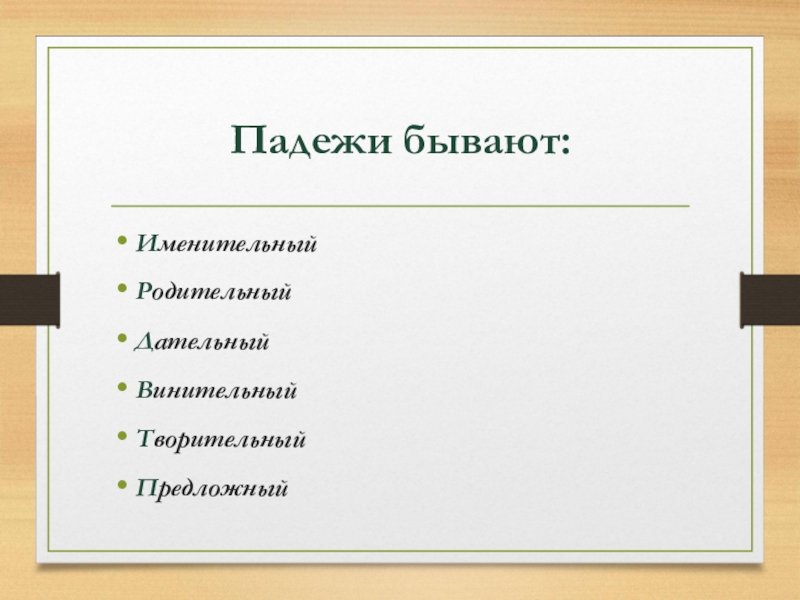 Падежи бывают:ИменительныйРодительный ДательныйВинительный Творительный Предложный