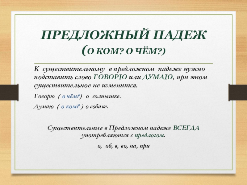 ПРЕДЛОЖНЫЙ ПАДЕЖ (О КОМ? О ЧЁМ?)К существительному в предложном падеже нужно подставить слово ГОВОРЮ или ДУМАЮ, при