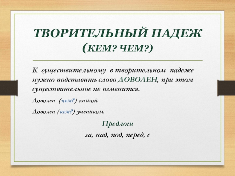 ТВОРИТЕЛЬНЫЙ ПАДЕЖ (КЕМ? ЧЕМ?)К существительному в творительном падеже нужно подставить слово ДОВОЛЕН, при этом существительное не изменится.Доволен