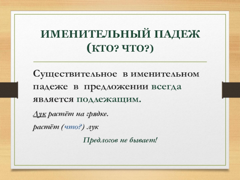ИМЕНИТЕЛЬНЫЙ ПАДЕЖ (КТО? ЧТО?)Существительное в именительном падеже в предложении всегда является подлежащим.Лук растёт на грядке.растёт (что?) лукПредлогов