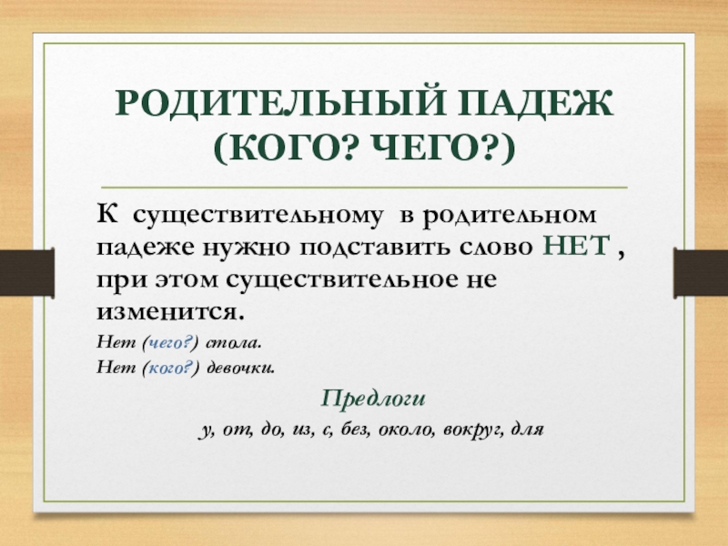 РОДИТЕЛЬНЫЙ ПАДЕЖ (КОГО? ЧЕГО?)К существительному в родительном падеже нужно подставить слово НЕТ , при этом существительное не