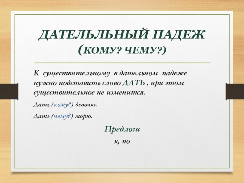 ДАТЕЛЬЛЬНЫЙ ПАДЕЖ (КОМУ? ЧЕМУ?)К существительному в дательном падеже нужно подставить слово ДАТЬ , при этом существительное не