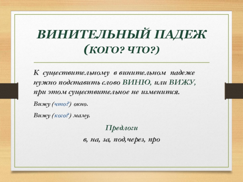ВИНИТЕЛЬНЫЙ ПАДЕЖ (КОГО? ЧТО?)К существительному в винительном падеже нужно подставить слово ВИНЮ, или ВИЖУ, при этом существительное
