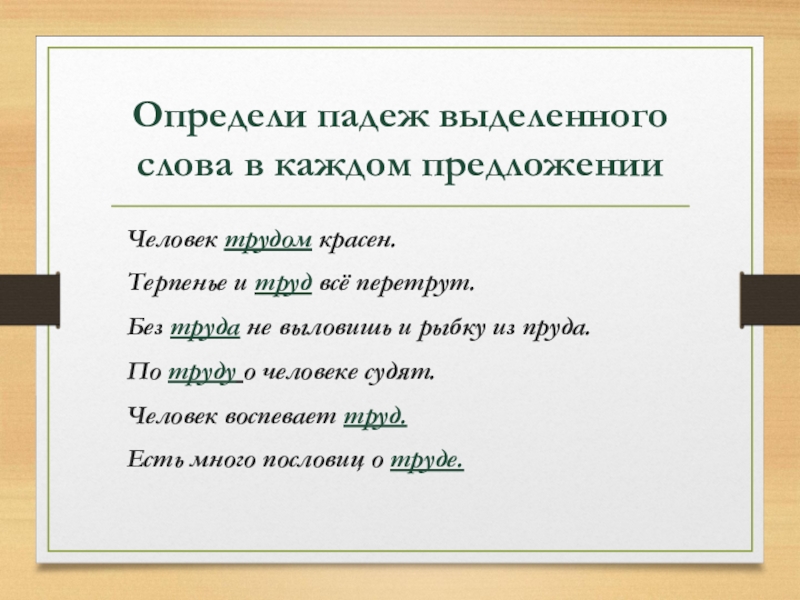 Определи падеж выделенного слова в каждом предложенииЧеловек трудом красен. Терпенье и труд всё перетрут. Без труда не