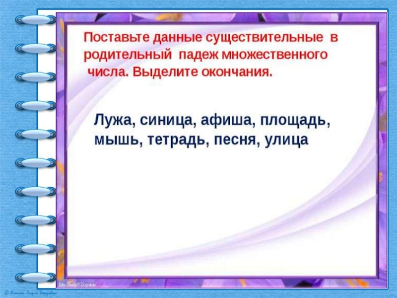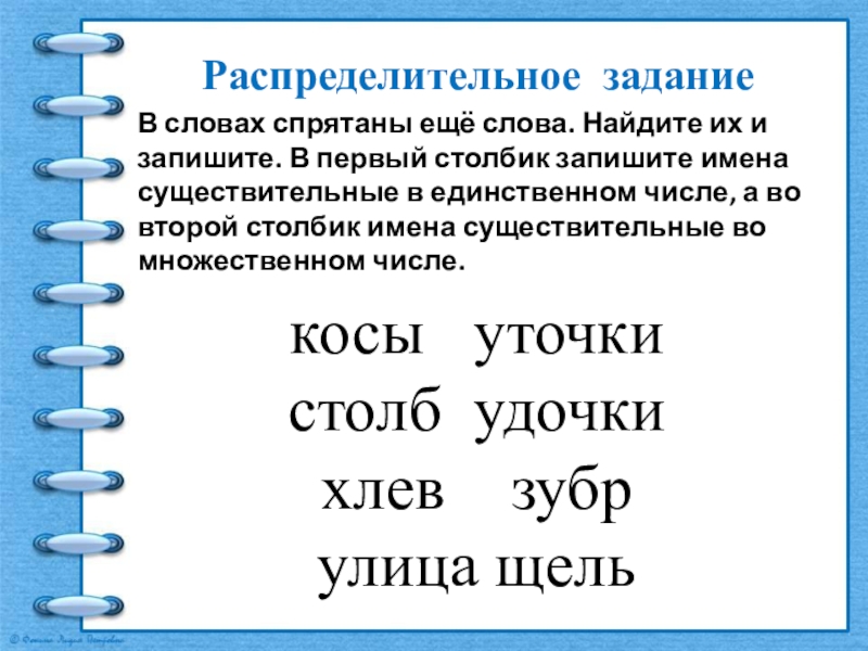 Распределительное задание В словах спрятаны ещё слова. Найдите их и запишите. В первый столбик запишите имена существительные в единственном числе, а во второй столбик имена существительные во множественном числе. косы уточки  столб удочки  хлев зубр