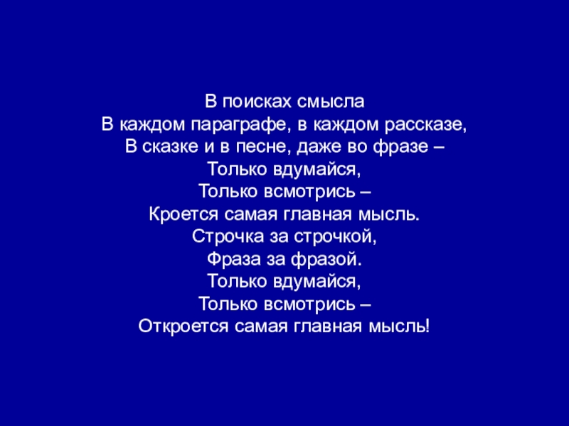В поисках смыслаВ каждом параграфе, в каждом рассказе,В сказке и в песне, даже во фразе – Только