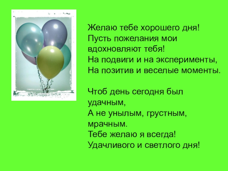 Желаю тебе хорошего дня!Пусть пожелания мои вдохновляют тебя!На подвиги и на эксперименты,На позитив и веселые моменты.Чтоб день