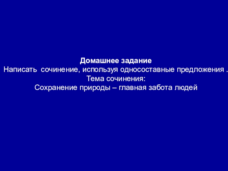 Домашнее заданиеНаписать сочинение, используя односоставные предложения . Тема сочинения: Сохранение природы – главная забота людей