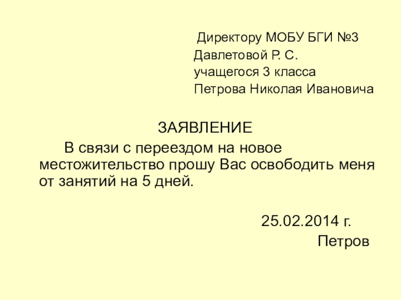 В связи с переездом на новое местожительство прошу Вас освободить меня от занятий на 5 дней.