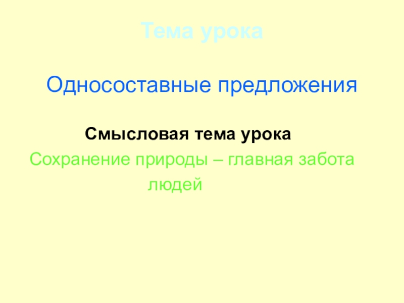 Тема урока   Односоставные предложения     			Смысловая тема урока Сохранение природы