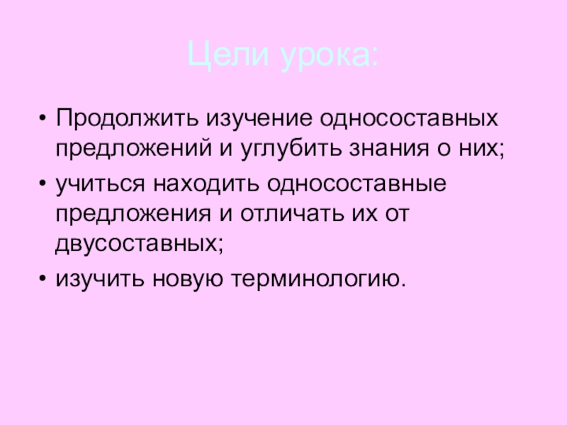 Цели урока:Продолжить изучение односоставных предложений и углубить знания о них;учиться находить односоставные предложения и отличать их от