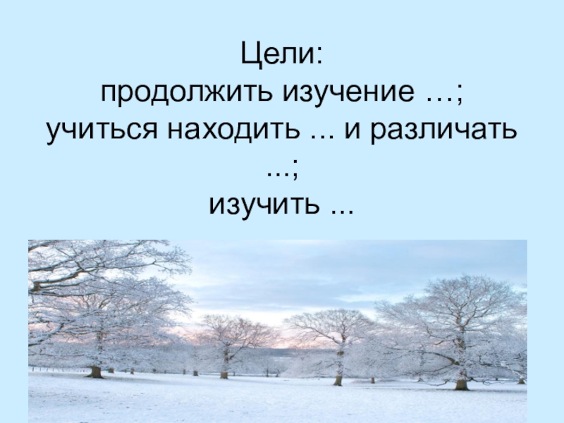 Слайд 4 Цели: продолжить изучение …; учиться находить ... и различать ...; изучить ...