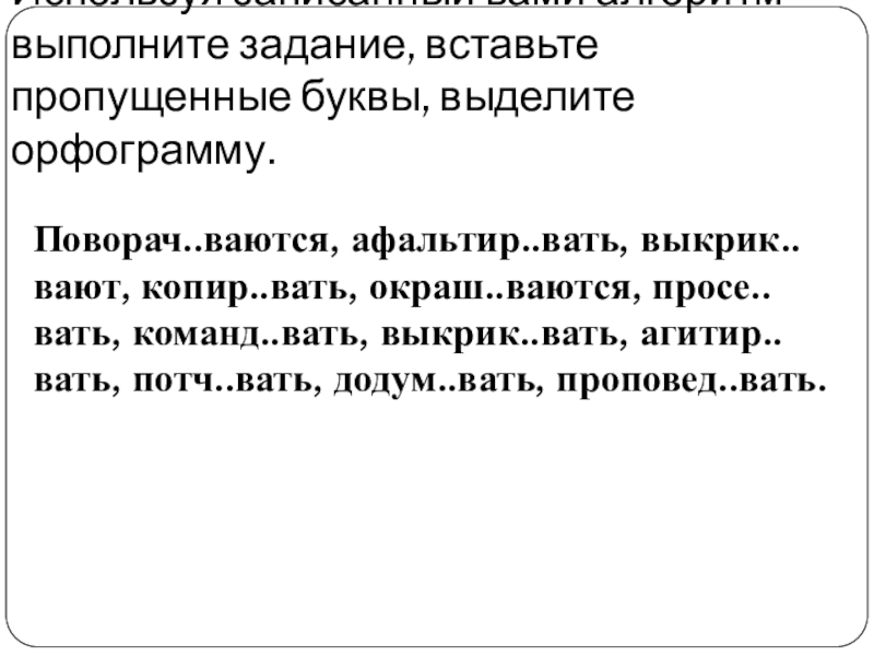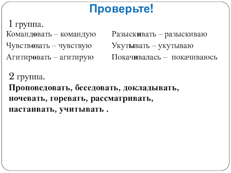 Проповед..вать, бесед..вать, доклад..вать, ноч..вать, гор..вать, рассматр..вать, наста..вать, учит..вать .