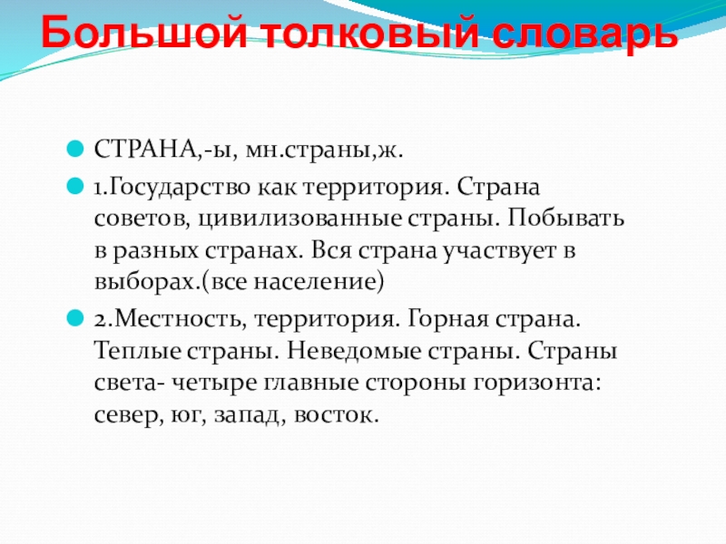 2.Местность, территория. Горная страна. Теплые страны. Неведомые страны. Страны света- четыре главные стороны горизонта: север, юг, запад, восток.