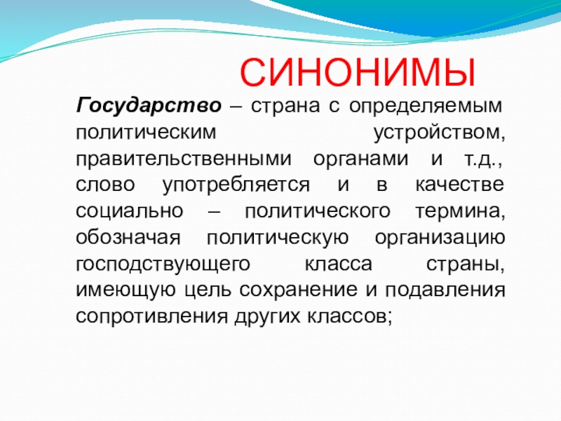 слово употребляется и в качестве социально – политического термина, обозначая политическую организацию господствующего класса страны, имеющую цель сохранение и подавления сопротивления других классов;