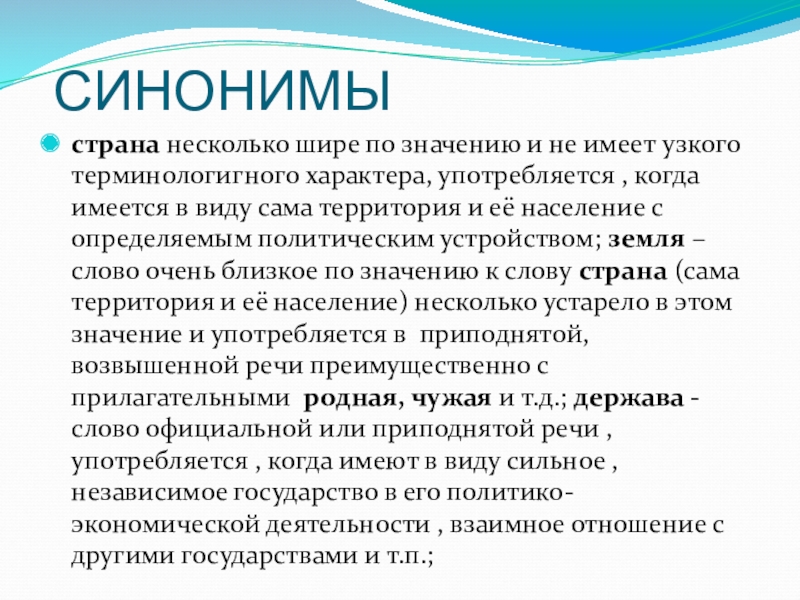 употребляется , когда имеется в виду сама территория и её население с определяемым политическим устройством; земля – слово очень близкое по значению к слову страна (сама территория и её население) несколько устарело в этом значение и употребляется в приподнятой, возвышенной речи преимущественно с прилагательными родная, чужая и т.д.; держава - слово официальной или приподнятой речи , употребляется , когда имеют в виду сильное , независимое государство в его политико- экономической деятельности , взаимное отношение с другими государствами и т.п.;