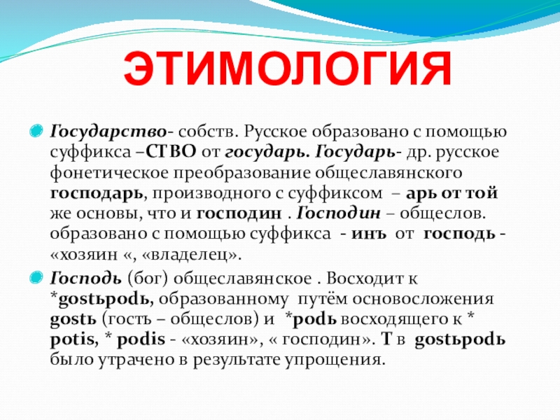 Государство- собств. Русское образовано с помощью суффикса –СТВО от