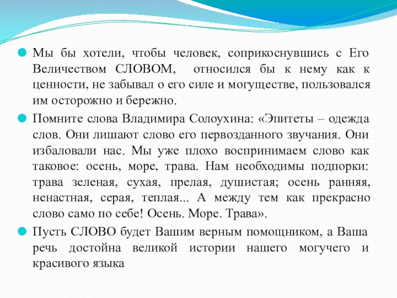 Слайд 20Мы бы хотели, чтобы человек, соприкоснувшись с Его Величеством СЛОВОМ, относился