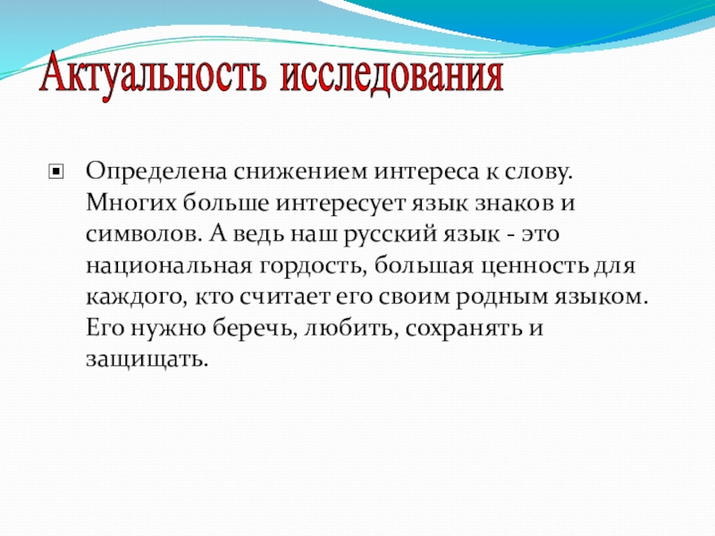 символов. А ведь наш русский язык - это национальная гордость, большая ценность для каждого, кто считает его своим родным языком. Его нужно беречь, любить, сохранять и защищать.