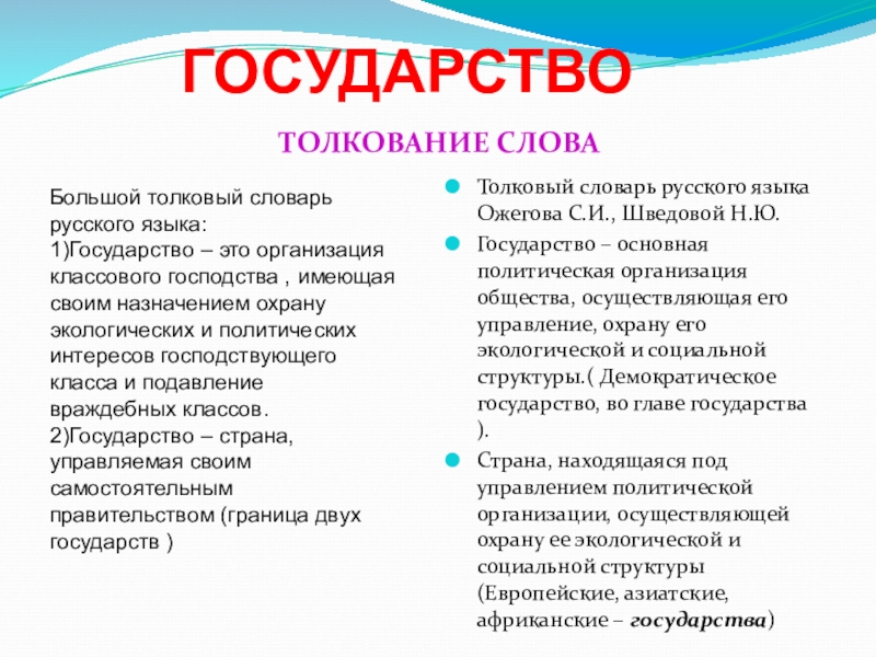 Государство – основная политическая организация общества, осуществляющая его управление, охрану его экологической и социальной структуры.( Демократическое государство, во главе государства ).