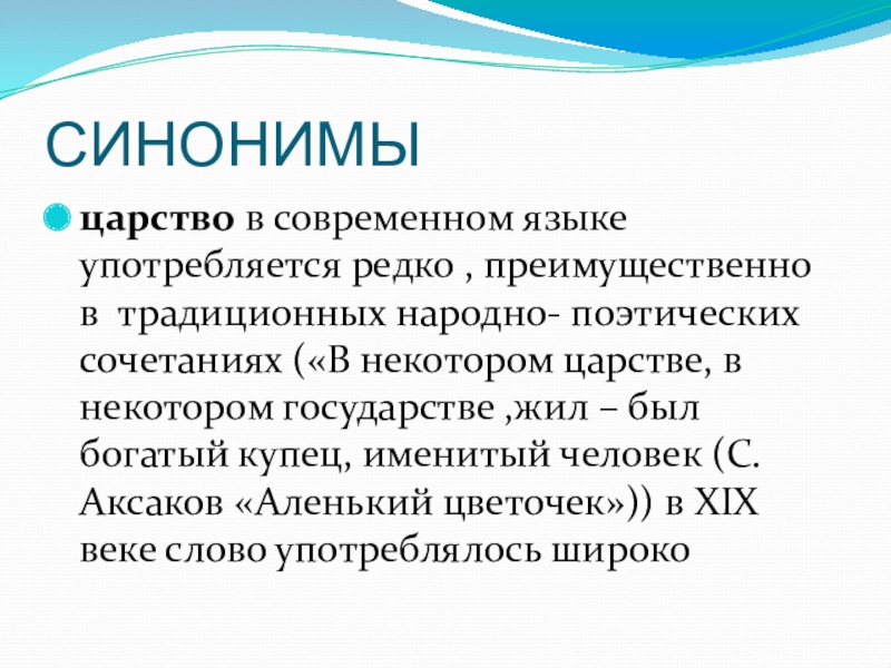 поэтических сочетаниях («В некотором царстве, в некотором государстве ,жил – был богатый купец, именитый человек (С. Аксаков «Аленький цветочек»)) в XIX веке слово употреблялось широко