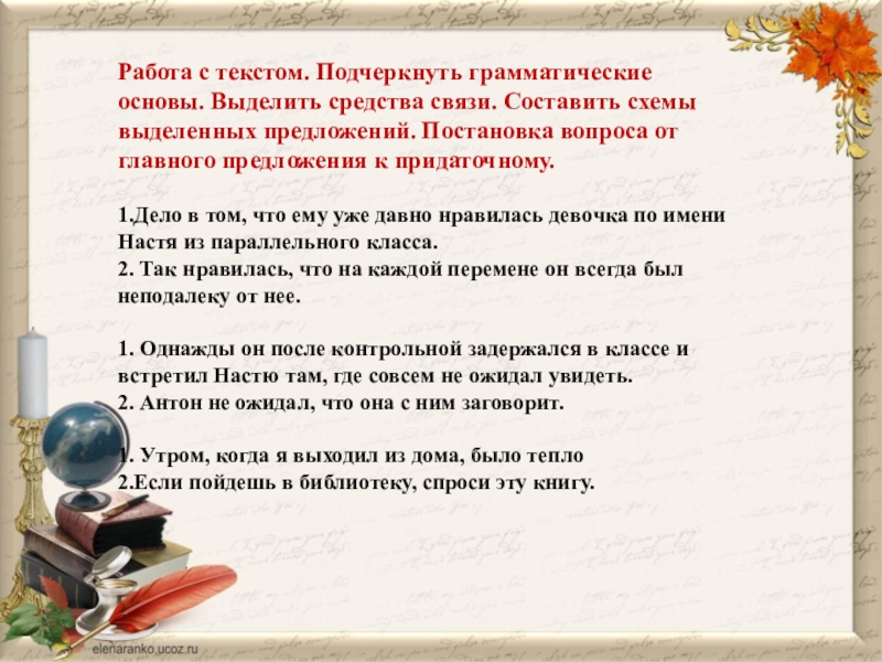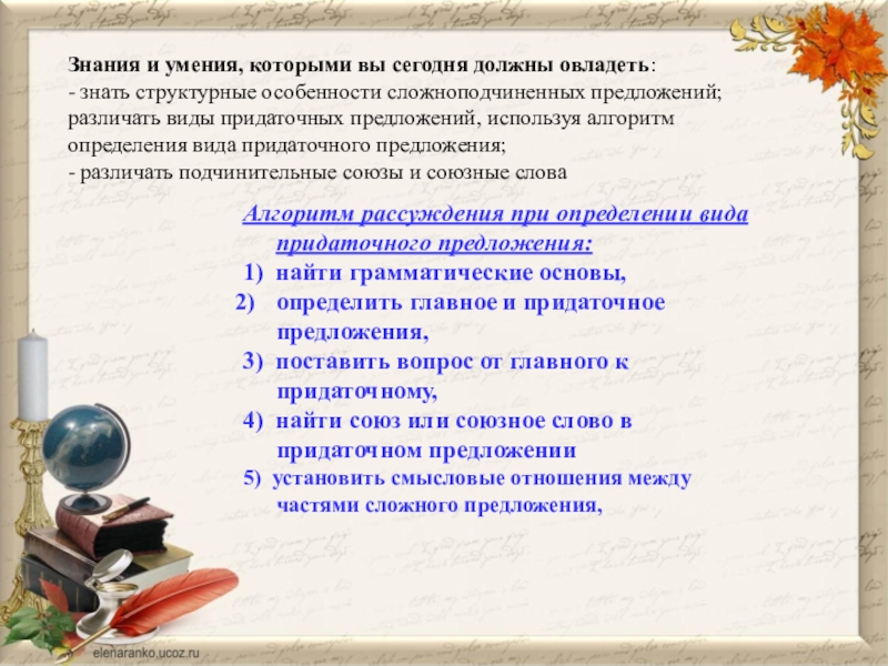 - знать структурные особенности сложноподчиненных предложений; различать виды придаточных предложений, используя алгоритм определения вида придаточного предложения;