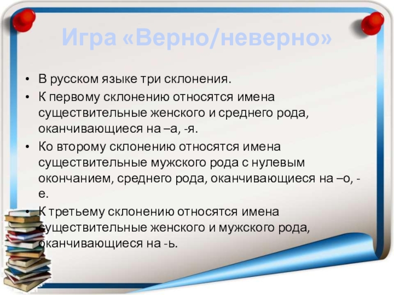 Игра «Верно/неверно»В русском языке три склонения.К первому склонению относятся имена существительные женского и среднего рода, оканчивающиеся на