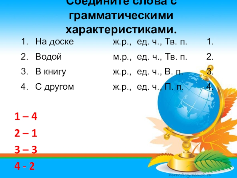 Соедините слова с грамматическими характеристиками.1 – 42 – 13 – 34 - 2