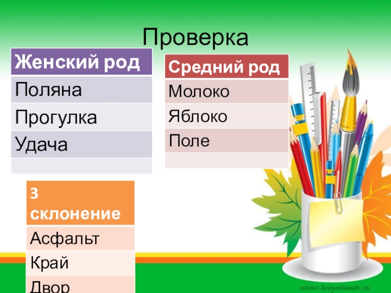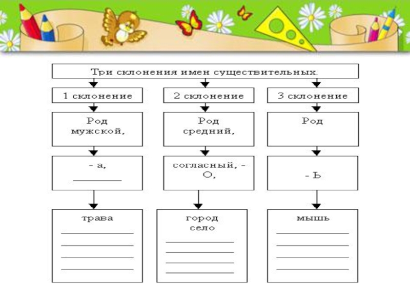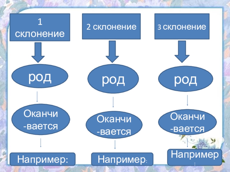 1 склонение2 склонение3 склонениеродродродОканчи-ваетсяОканчи-ваетсяОканчи-ваетсяНапример:Например:Например: