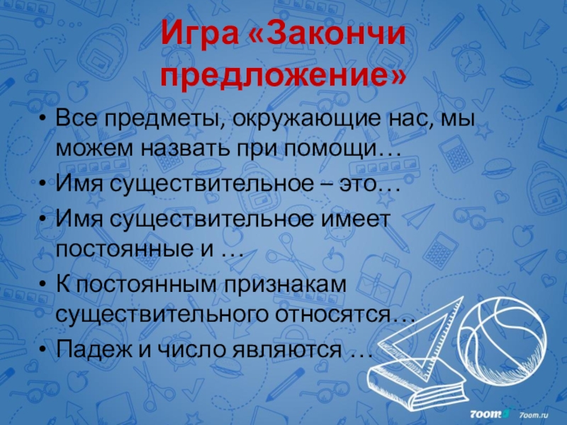 Игра «Закончи предложение»Все предметы, окружающие нас, мы можем назвать при помощи…Имя существительное – это…Имя существительное имеет постоянные и …К постоянным признакам существительного относятся…Падеж и число являются …