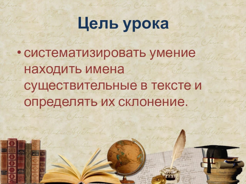 Цель урокасистематизировать умение находить имена существительные в тексте и определять их склонение.
