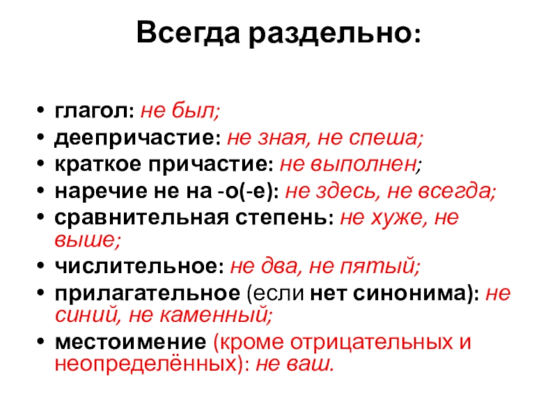 Всегда раздельно: глагол: не был;деепричастие: не зная, не спеша;краткое причастие: не выполнен;наречие не на -о(-е): не здесь,