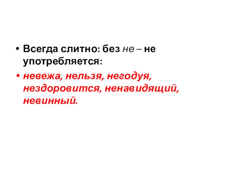 Всегда слитно: без не – не употребляется:невежа, нельзя, негодуя, нездоровится, ненавидящий, невинный.