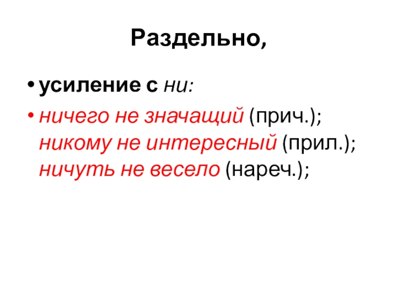 Раздельно,усиление с ни: ничего не значащий (прич.); никому не интересный (прил.); ничуть не весело (нареч.);