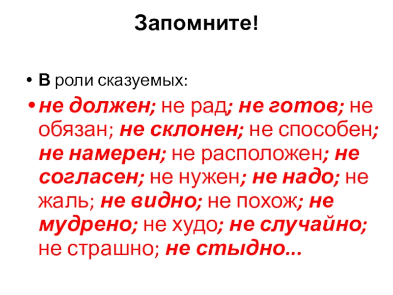 Запомните! В роли сказуемых:не должен; не рад; не готов; не обязан; не склонен; не способен; не намерен;