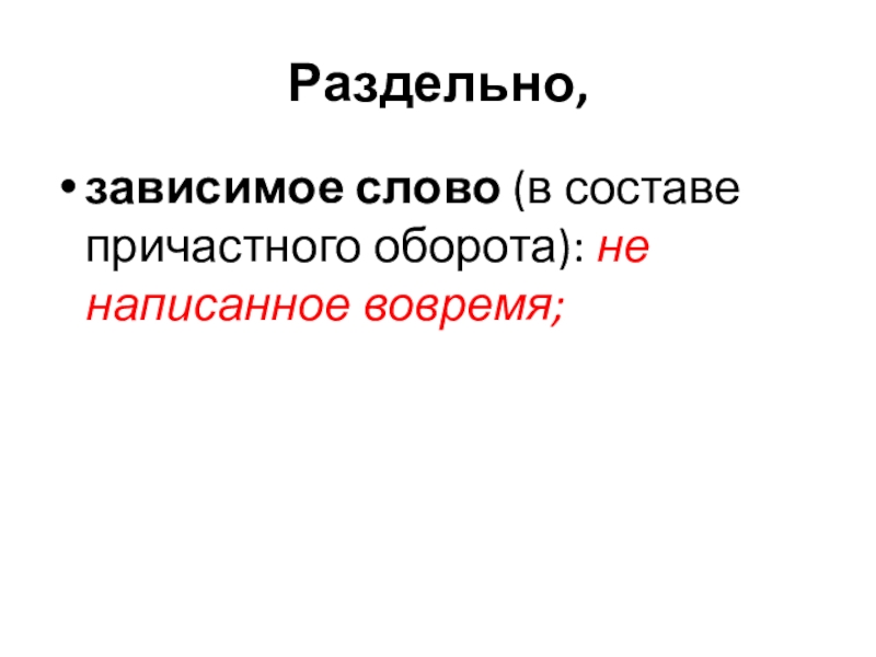 Раздельно,зависимое слово (в составе причастного оборота): не написанное вовремя;