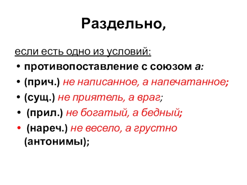 Раздельно,если есть одно из условий:противопоставление с союзом а:(прич.) не написанное, а напечатанное;(сущ.) не приятель, а враг; (прил.)