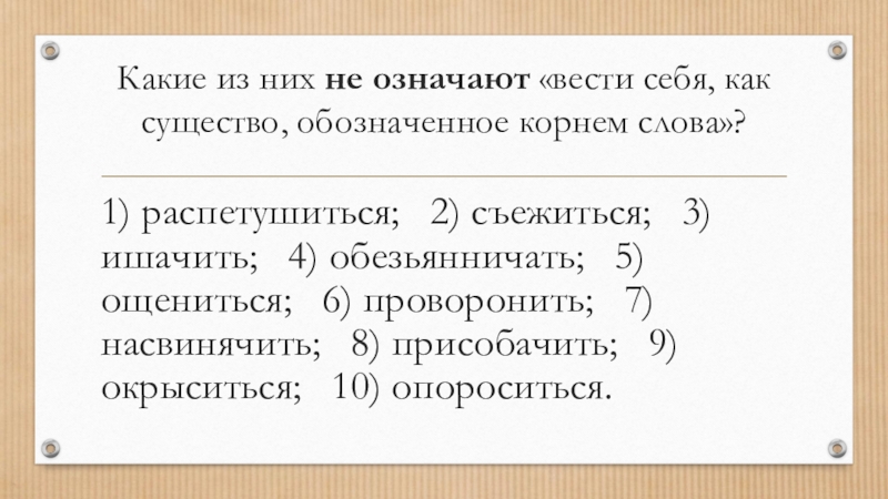 1) распетушиться; 2) съежиться; 3) ишачить; 4) обезьянничать; 5) ощениться; 6) проворонить; 7) насвинячить; 8) присобачить; 9) окрыситься; 10) опороситься.