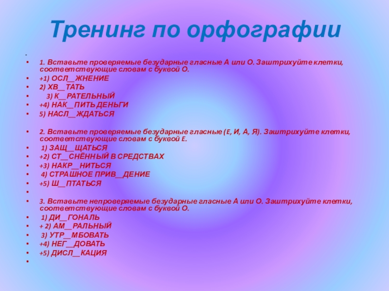 5. Вставьте чередующиеся безударные гласные А или О. Заштрихуйте клетки, соответствующие словам с буквой О.