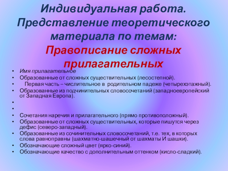 Слайд 11Индивидуальная работа. Представление теоретического материала по темам: Правописание сложных прилагательных