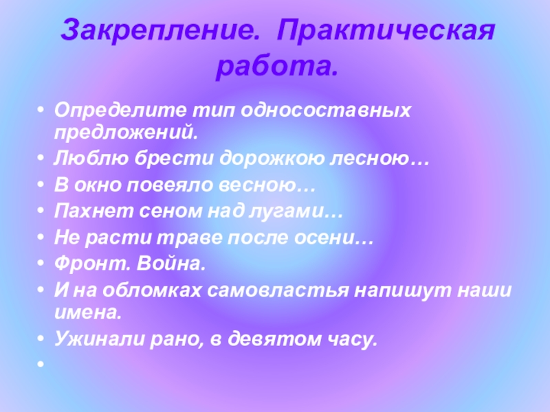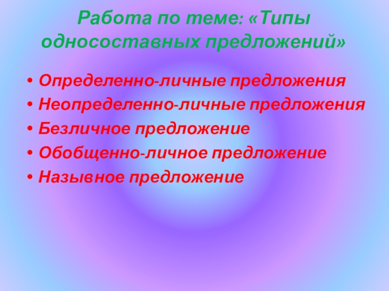 Слайд 15Работа по теме: «Типы односоставных предложений»