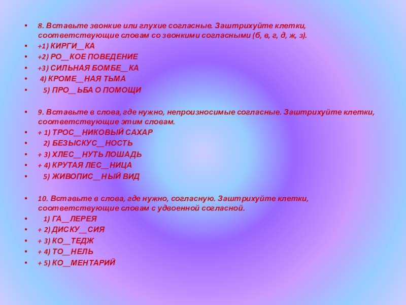 Слайд 98. Вставьте звонкие или глухие согласные. Заштрихуйте клетки, соответствующие словам со