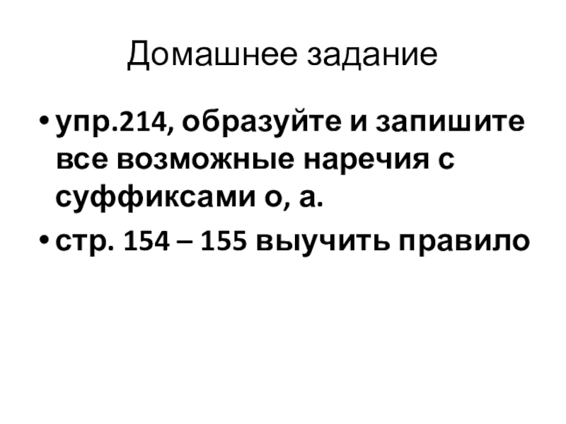Домашнее заданиеупр.214, образуйте и запишите все возможные наречия с суффиксами о, а.стр. 154 – 155 выучить правило