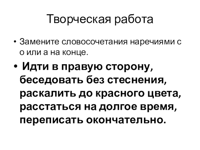 Творческая работаЗамените словосочетания наречиями с о или а на конце. Идти в правую сторону, беседовать без стеснения,