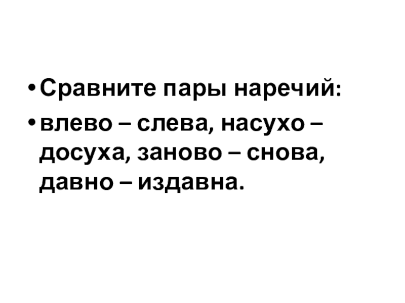 Сравните пары наречий: влево – слева, насухо – досуха, заново – снова, давно – издавна.
