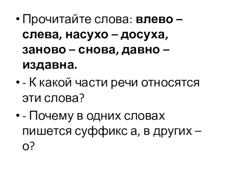 Прочитайте слова: влево – слева, насухо – досуха, заново – снова, давно – издавна.- К какой части речи относятся эти слова?- Почему в одних словах пишется суффикс а, в других – о?