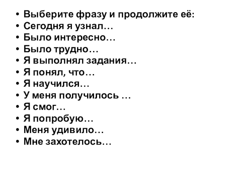 Выберите фразу и продолжите её:Сегодня я узнал… Было интересно… Было трудно… Я выполнял задания… Я понял, что…