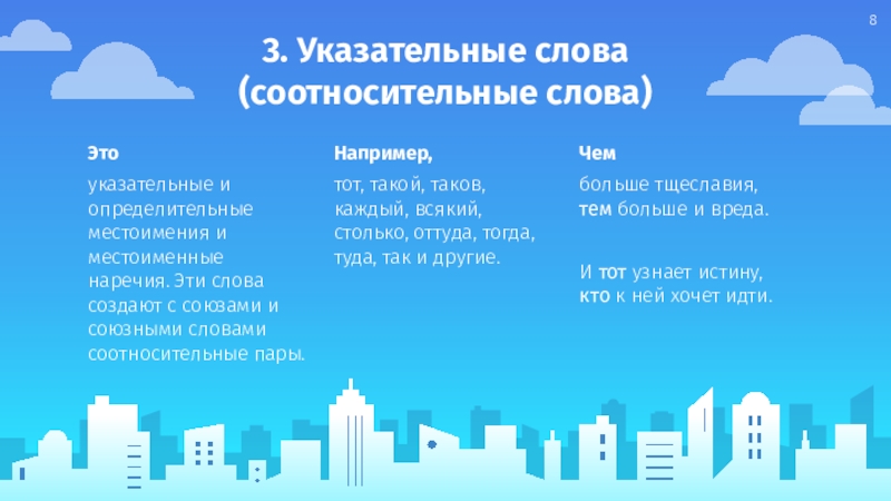 тот, такой, таков, каждый, всякий, столько, оттуда, тогда, туда, так и другие.