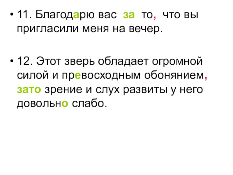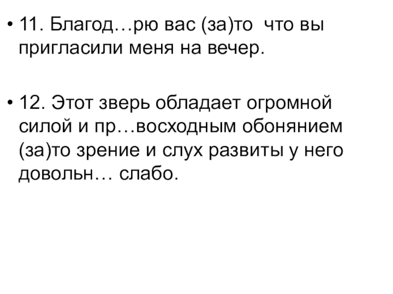 11. Благод…рю вас (за)то что вы пригласили меня на вечер.12. Этот зверь обладает огромной силой и пр…восходным