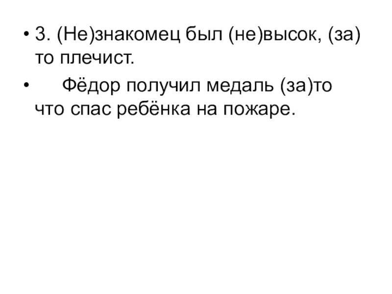 3. (Не)знакомец был (не)высок, (за)то плечист.   Фёдор получил медаль (за)то что спас ребёнка на пожаре.